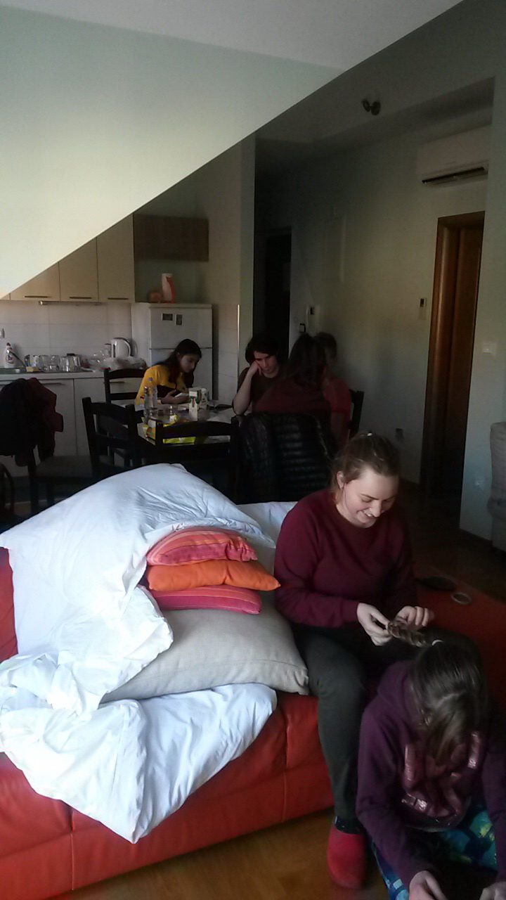 Kao svaka složna ekipa i mi smo imali individualne zadatke – Jurica je bi odgovoran za fiziku, Lucija je otvorila dvodnevni frizeraj, Gogo je bi „mali od điri i praveg puta“, Pufa u ulozi glavnog komentatora i zabavljača, Marta se je samo smijala cijelo vrijeme (valjda je zato tako dobro prošla?), Sara je pokušala igrat ulogu mirne i povučene djevojčice (iako na tome treba poradit), a Lara je zahuktalu atmosferu ove vesele družine držala pod kontrolom :).